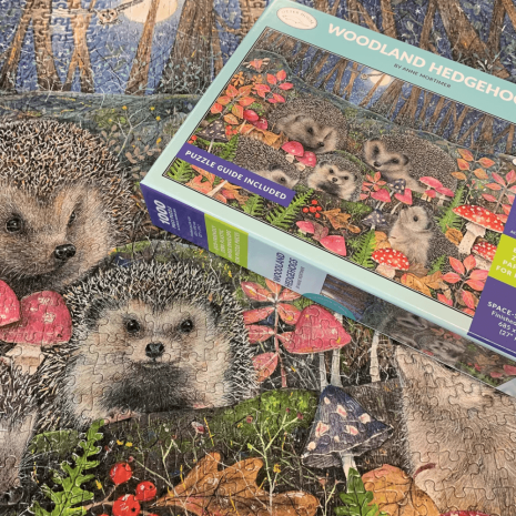 Woodland Hedgehogs. This enchanting 1000 piece jigsaw puzzle features adorable Hedgehogs in their natural woodland setting, showcasing the beauty of wildlife and the serene forest environment. A perfect choice for nature lovers and puzzle enthusiasts, this puzzle offers a peaceful and rewarding challenge for adults. Whether you’re a fan of woodland creatures or detailed wildlife art, this Otter House puzzle is an ideal gift for any occasion or a lovely addition to your collection.